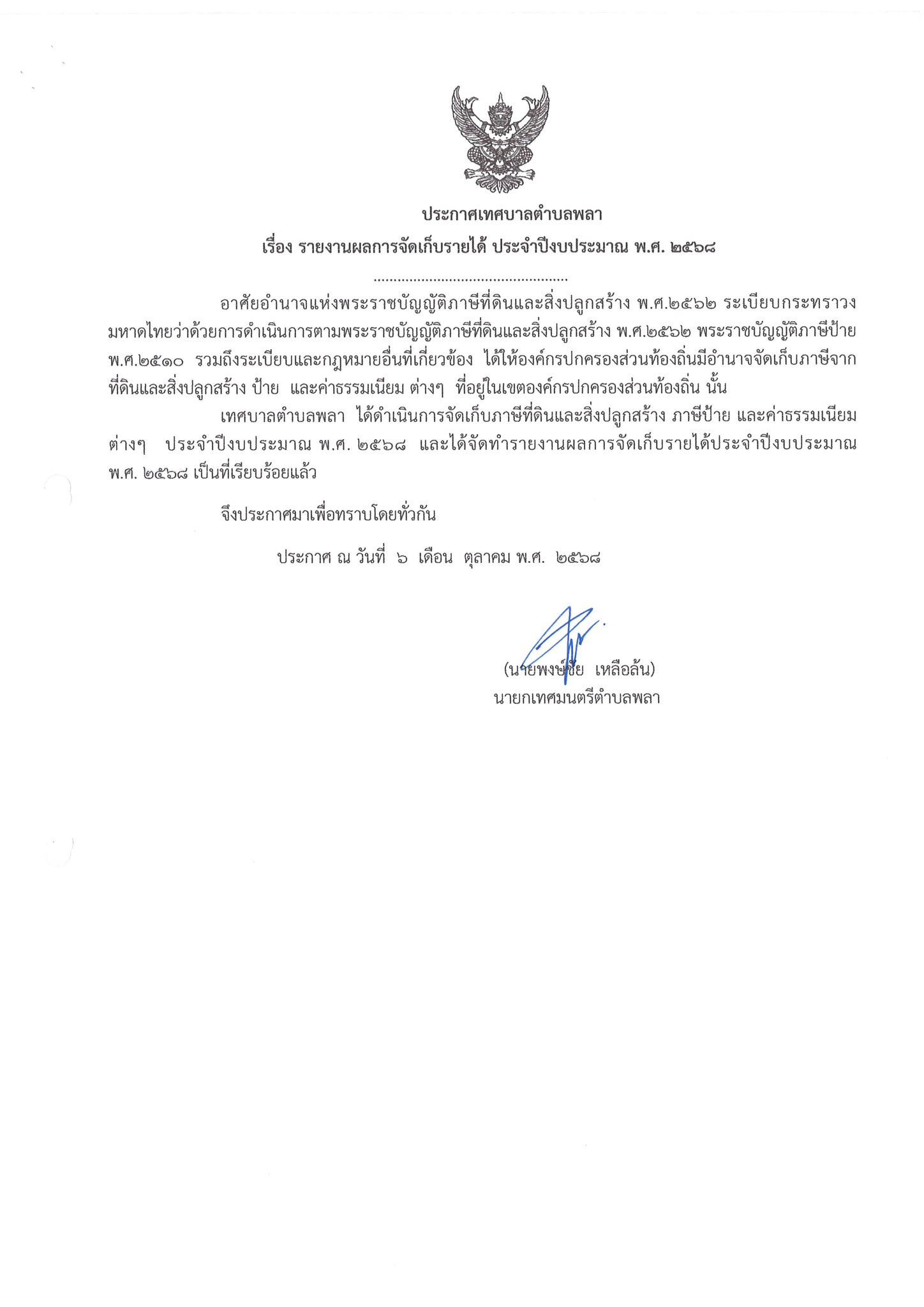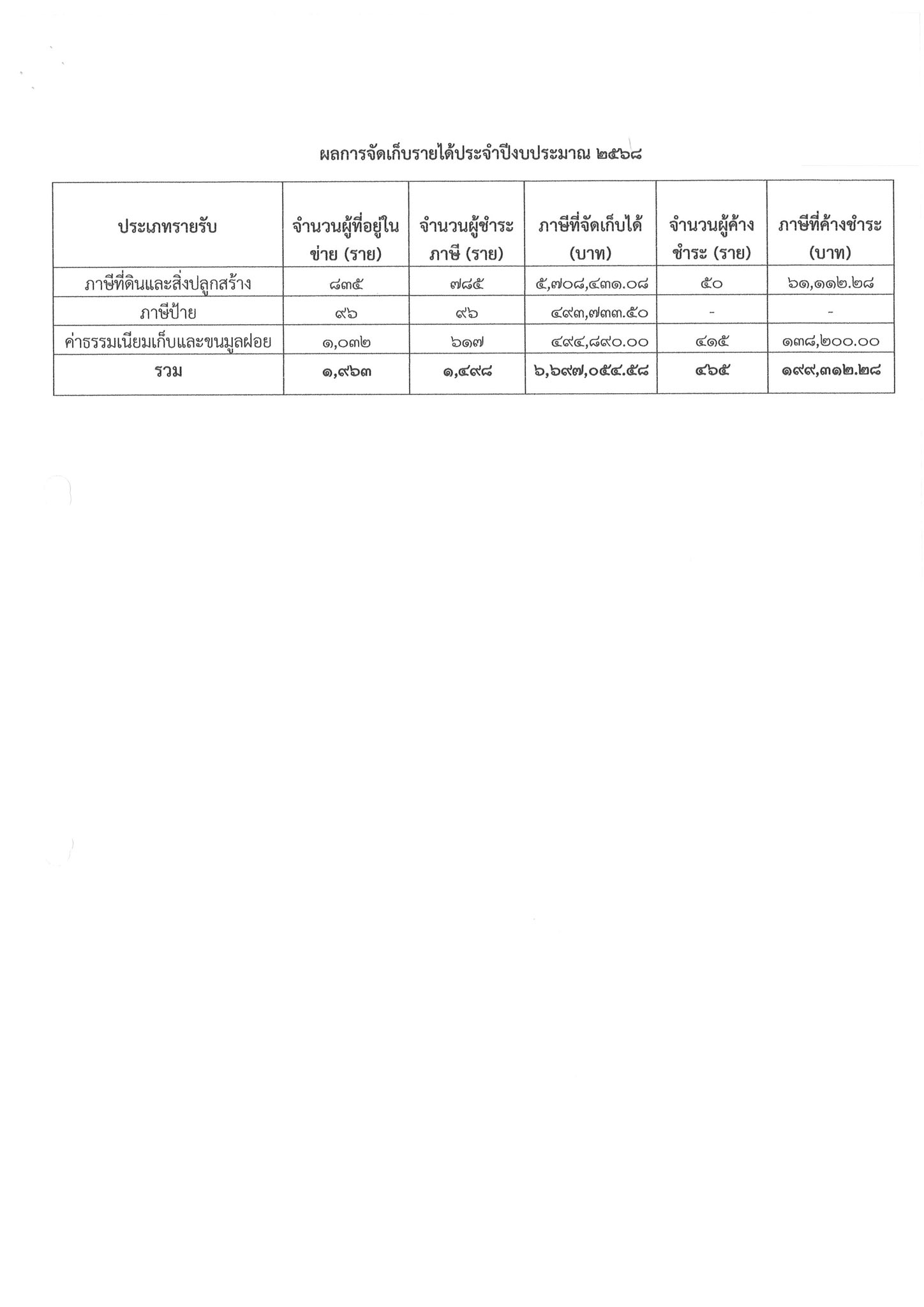 ประก่ศ เรื่อง รายงานผลการจัดเก็บรายได้ ประจำปีงบประมาณ พ.ศ.๒๕๖๘