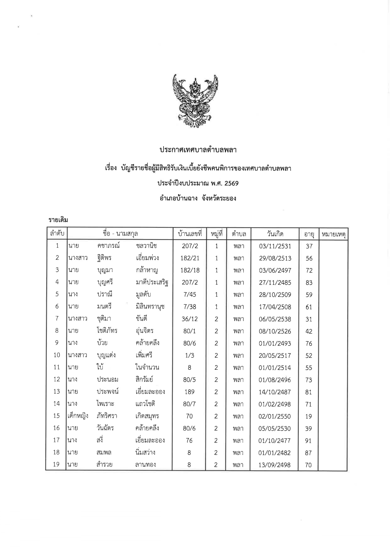 ประกาศ เรื่อง บัญชีรายชื่อผู้มีสิทธิรับเบี้ยยังชีพคนพิการของเทศบาลตำบลพลา ประจำปีงบประมาณ พ.ศ.๒๕๖๙