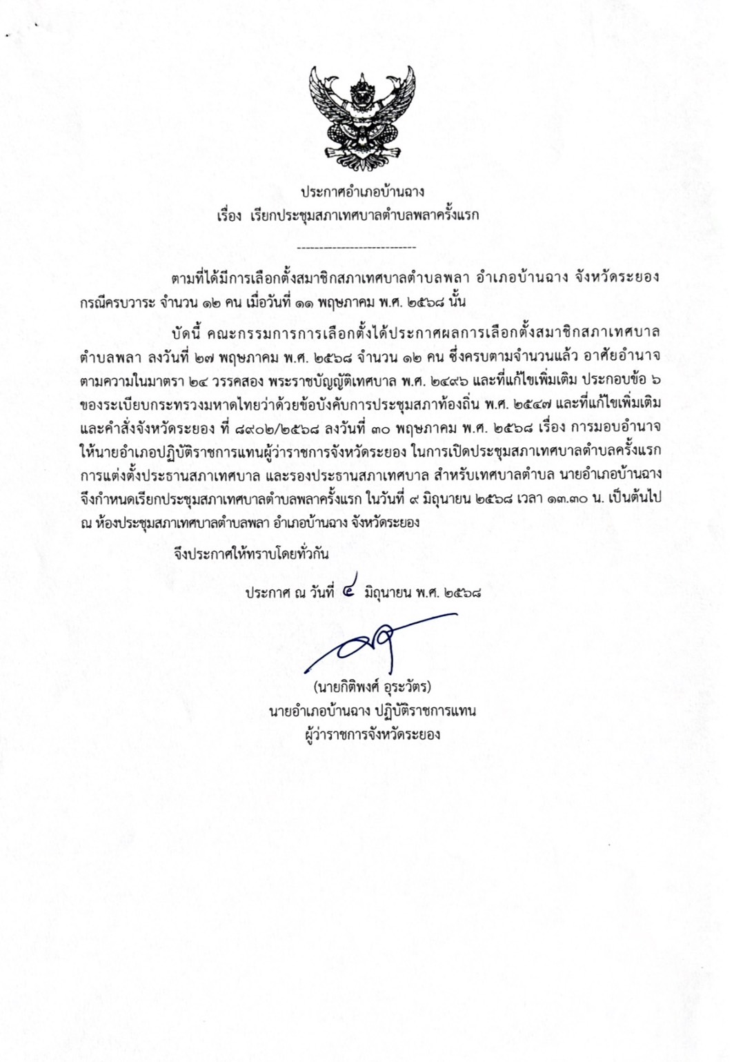 เรื่อง การเรียกประชุมสภาเทศบาลตำบลพลาครั้งแรก