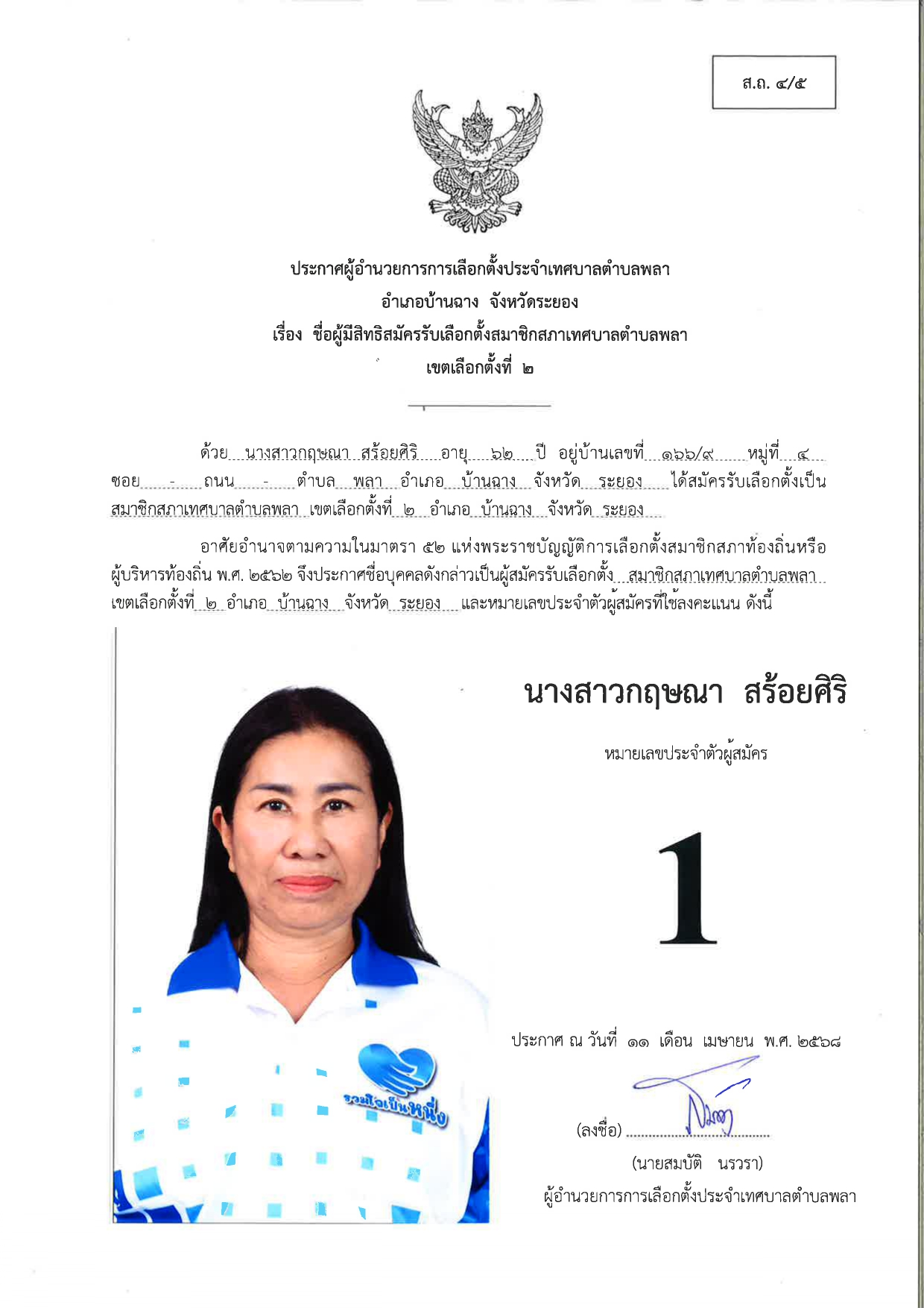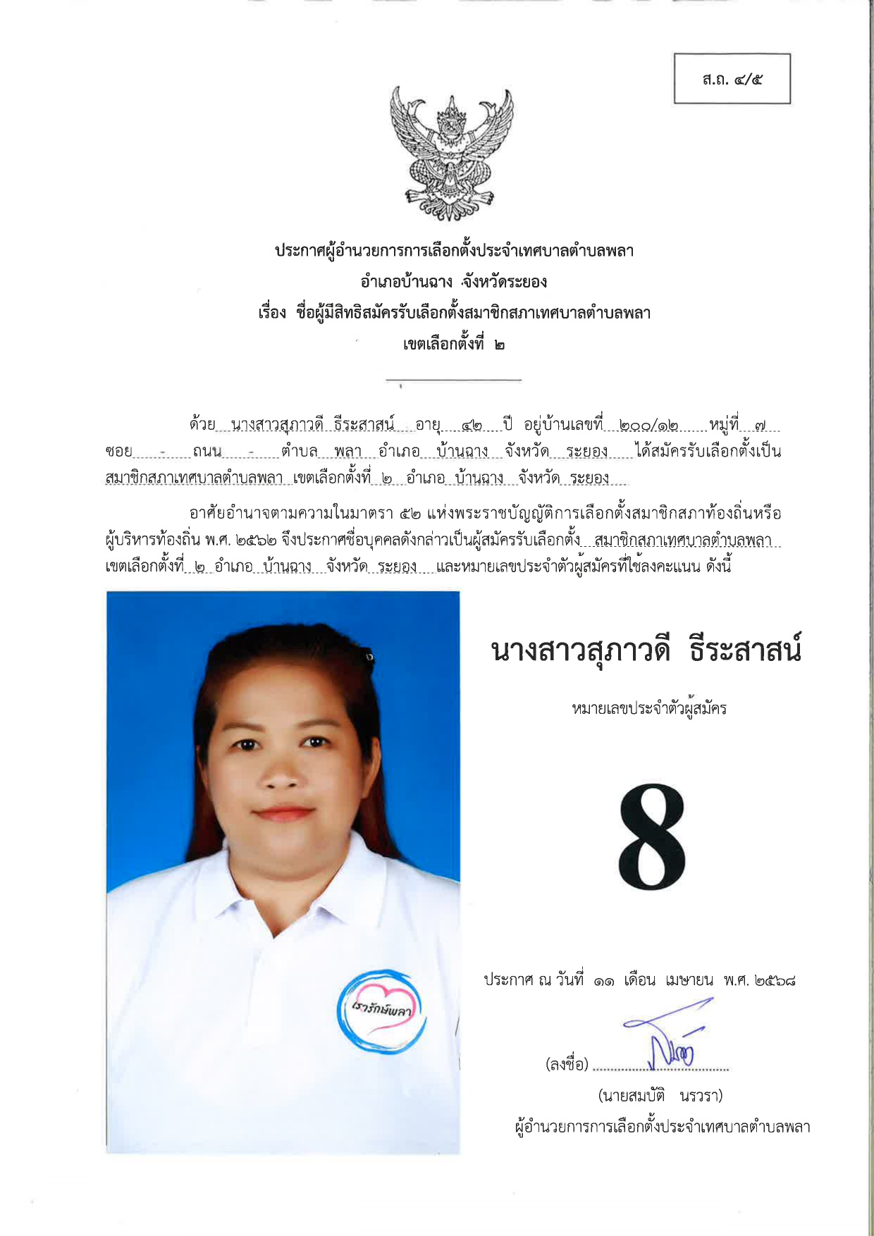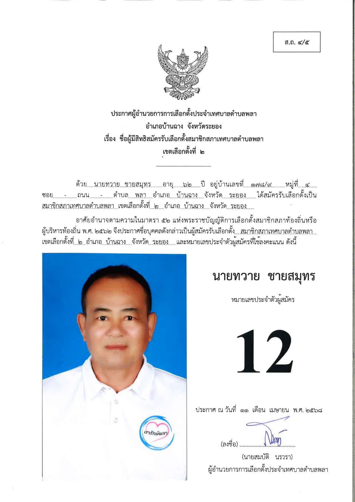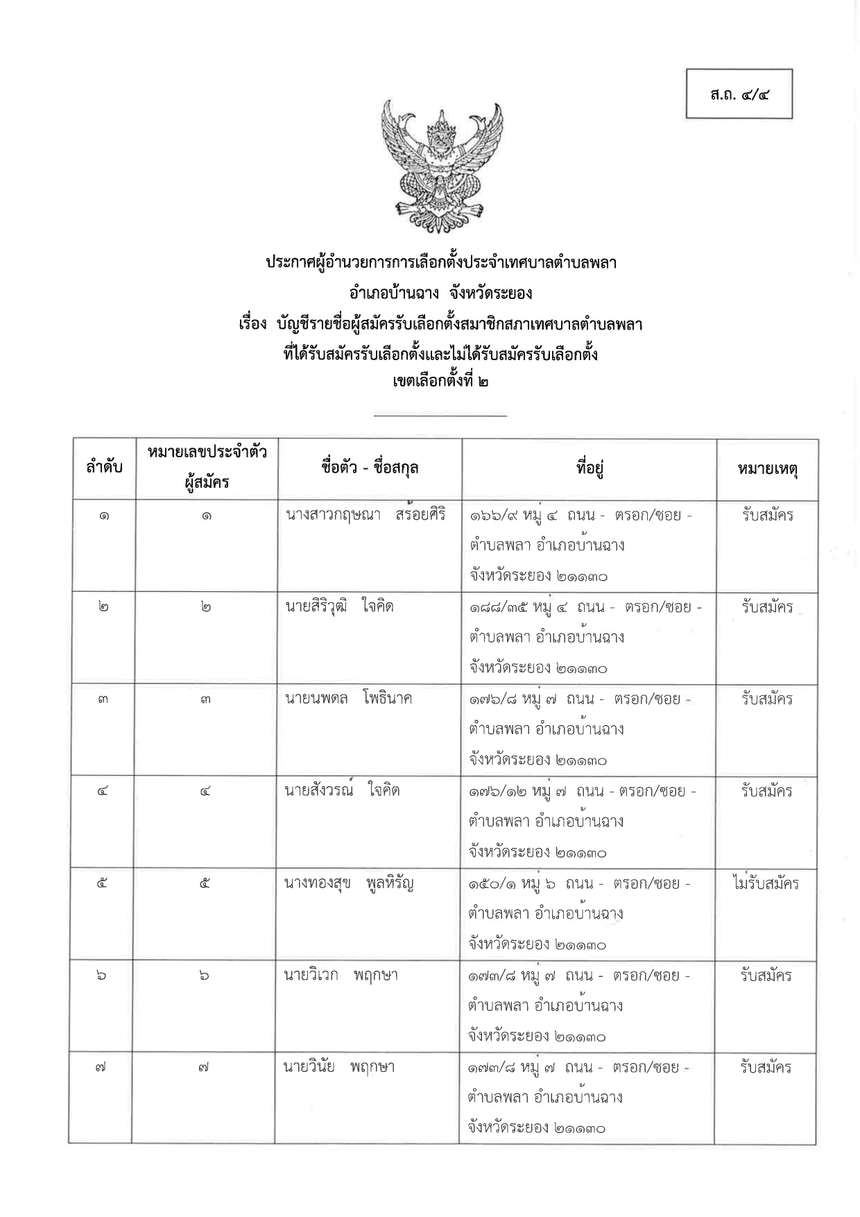 ประกาศ เรื่อง บัญชีรายชื่อผู้สมัครรับเลือกตั้งสมาชิกสภาเทศบาลตำบลพลา เขตเลือกตั้งที่ ๒