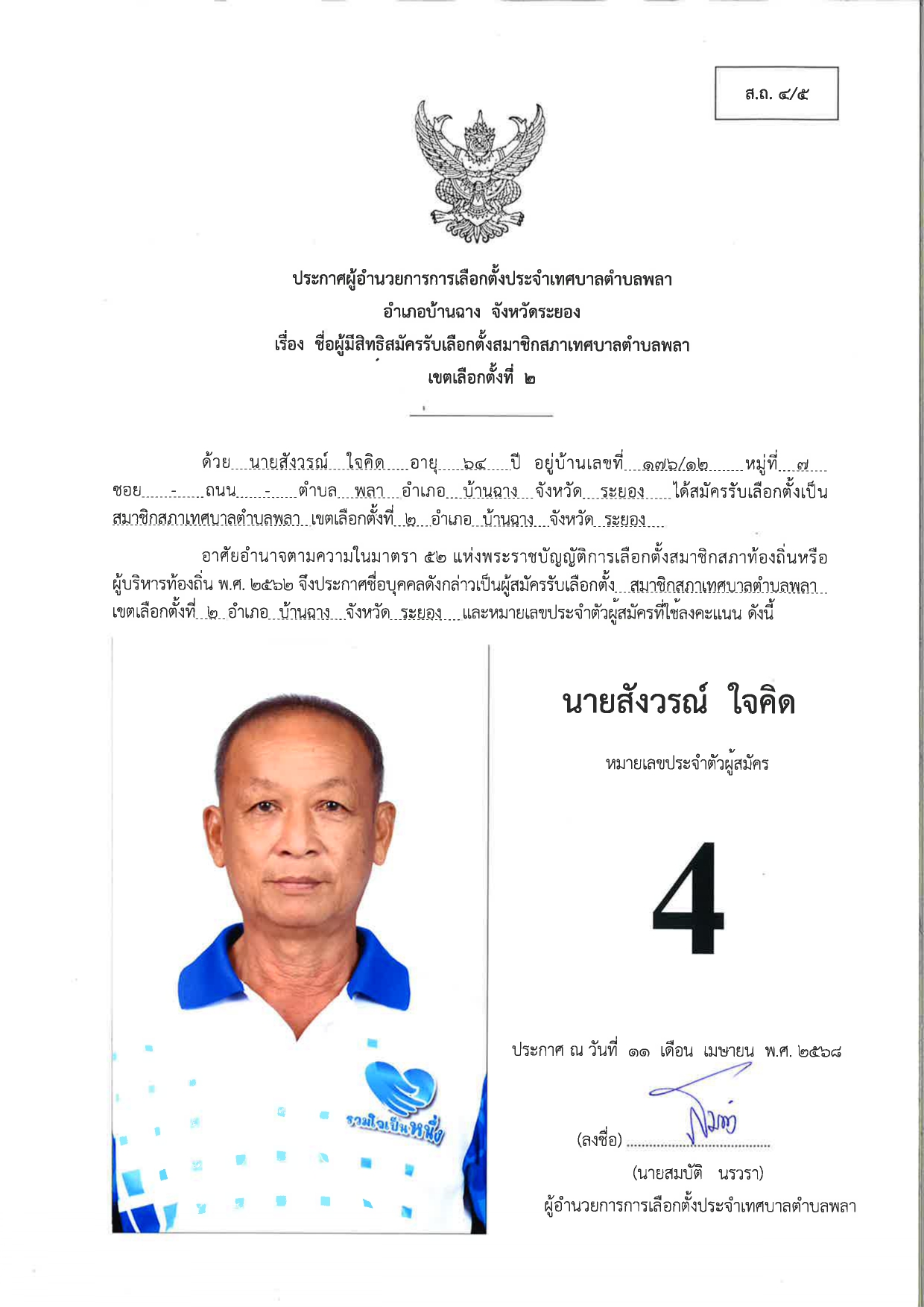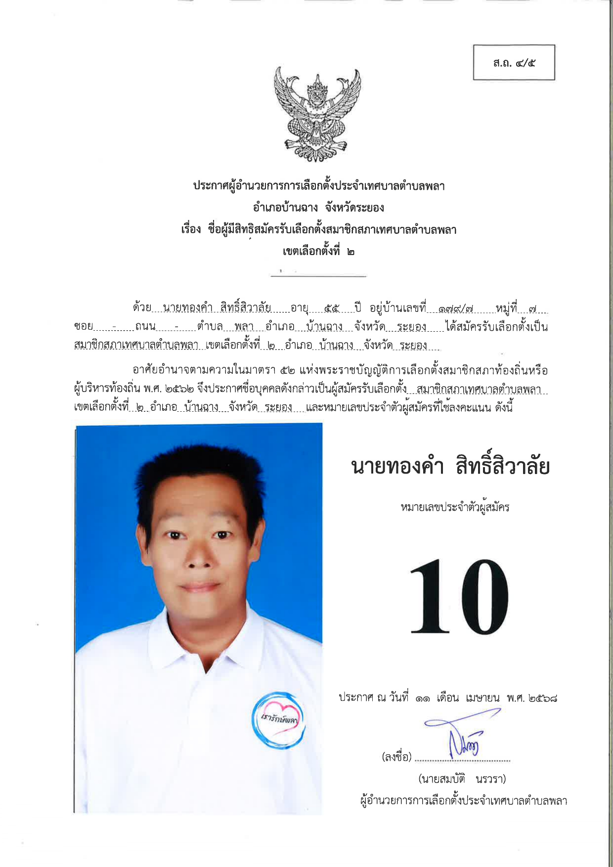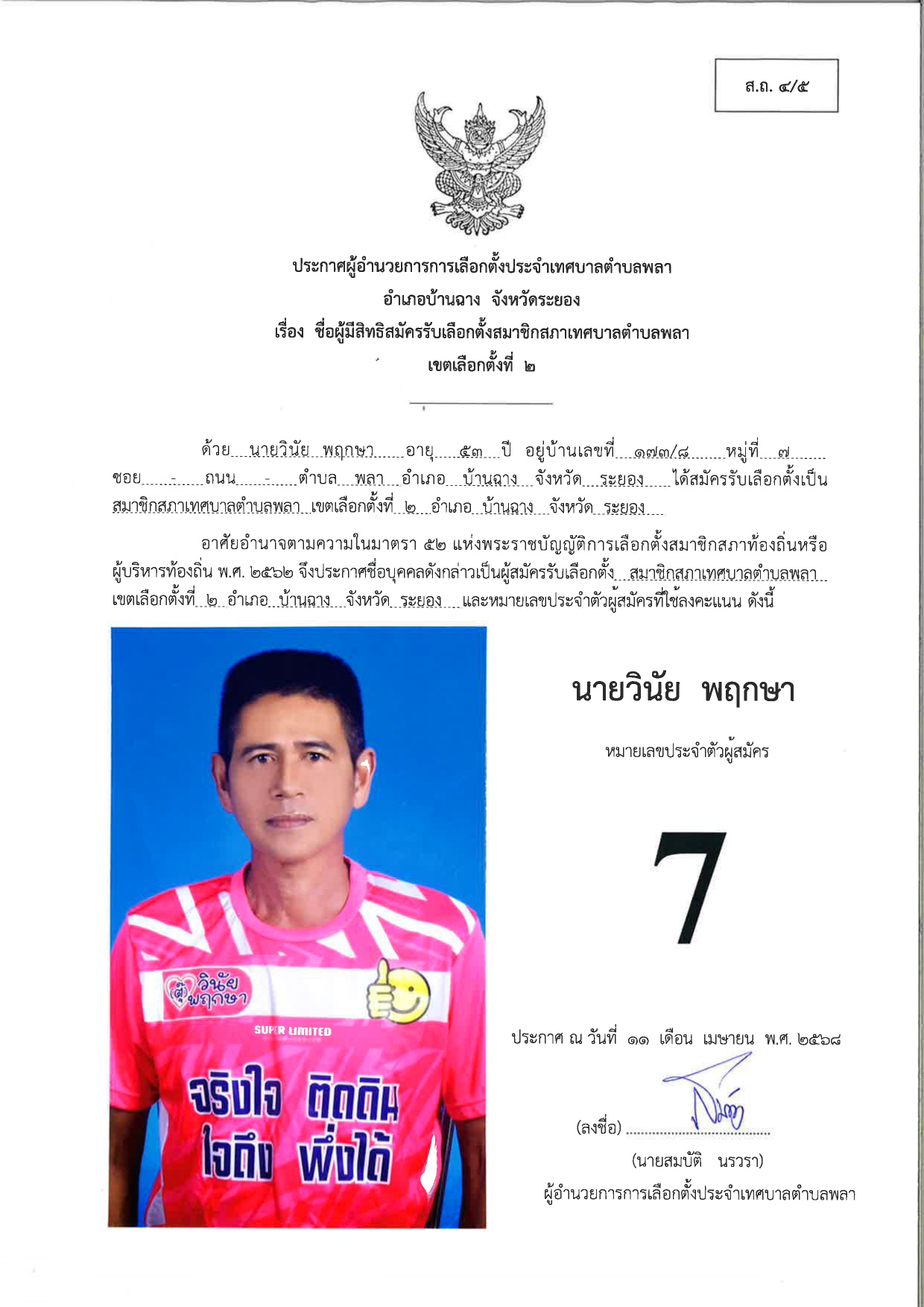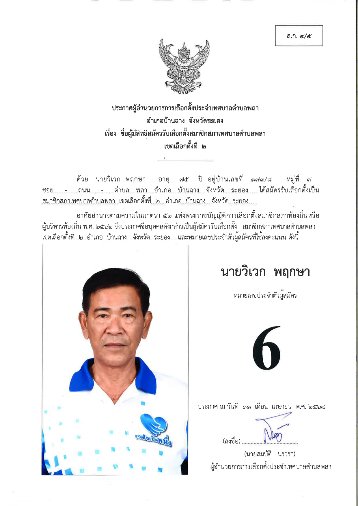 ประกาศ เรื่อง บัญชีรายชื่อผู้สมัครรับเลือกตั้งสมาชิกสภาเทศบาลตำบลพลา เขตเลือกตั้งที่ ๒