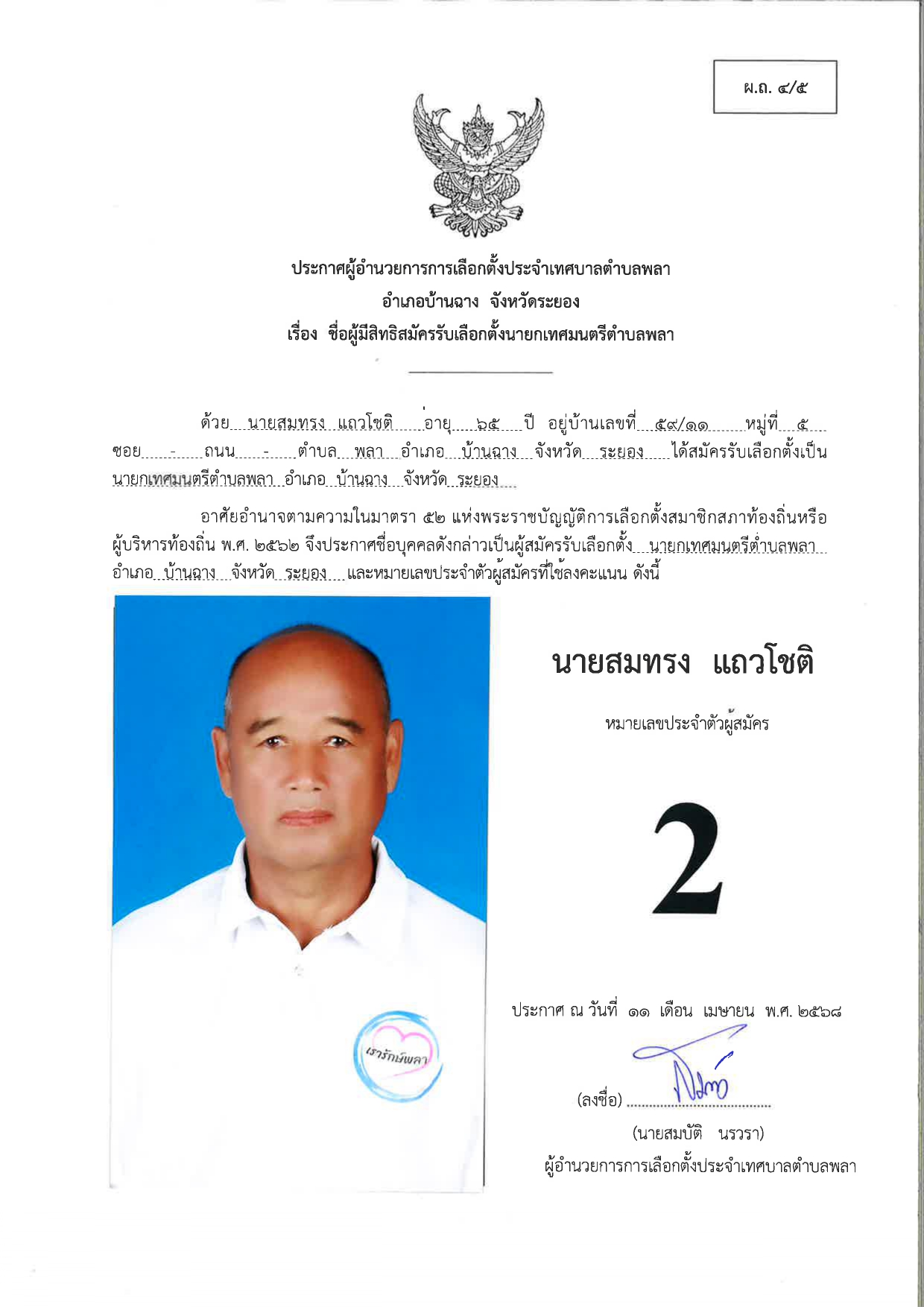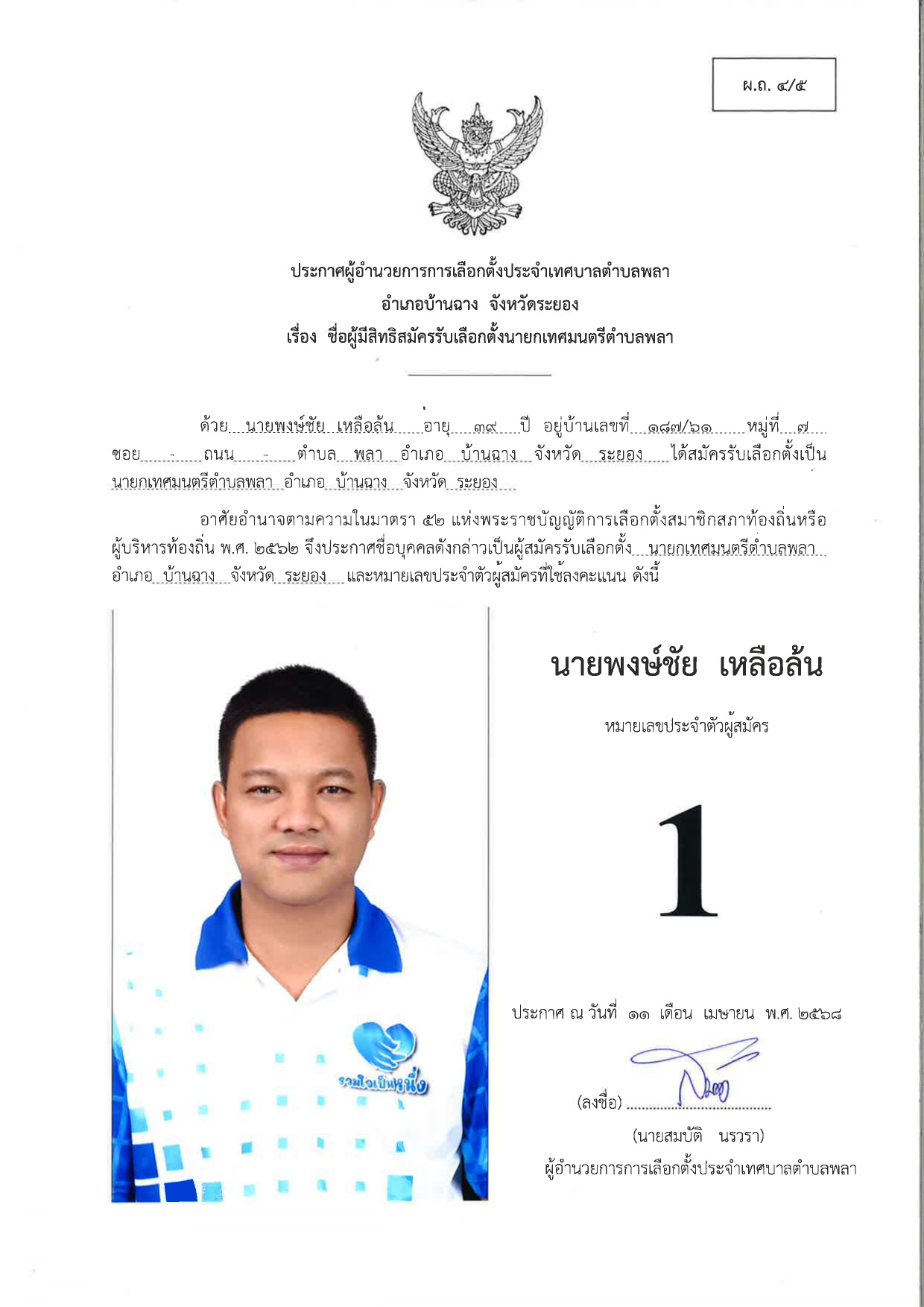 ประกาศ เรื่อง บัญชีรายชื่อผู้สมัครรับเลือกตั้งสมาชิกสภาเทศบาลตำบลพลา เขตเลือกตั้งที่ ๑