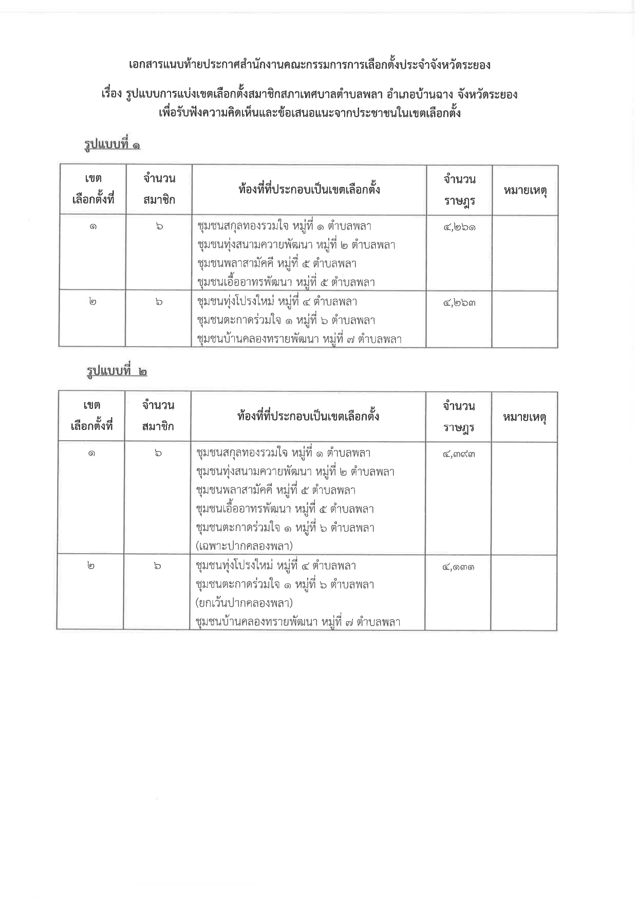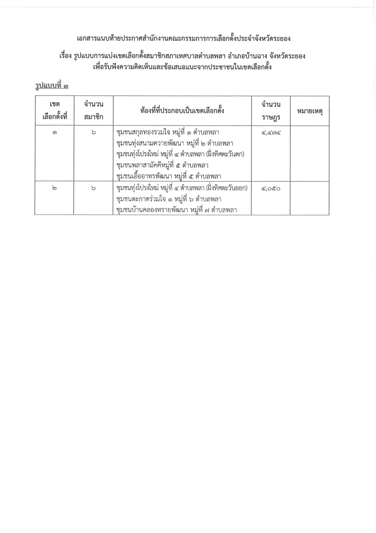 เรื่อง รูปแบบการแบ่งเขตเลือกตั้งสมชิกสภาเทศบาลตำบลพลา อำเภอบ้านฉาง เพื่อรับฟังความคิดเห็นและข้อเสนอแนะจากประชาชนในเขตเลือกตั้ง