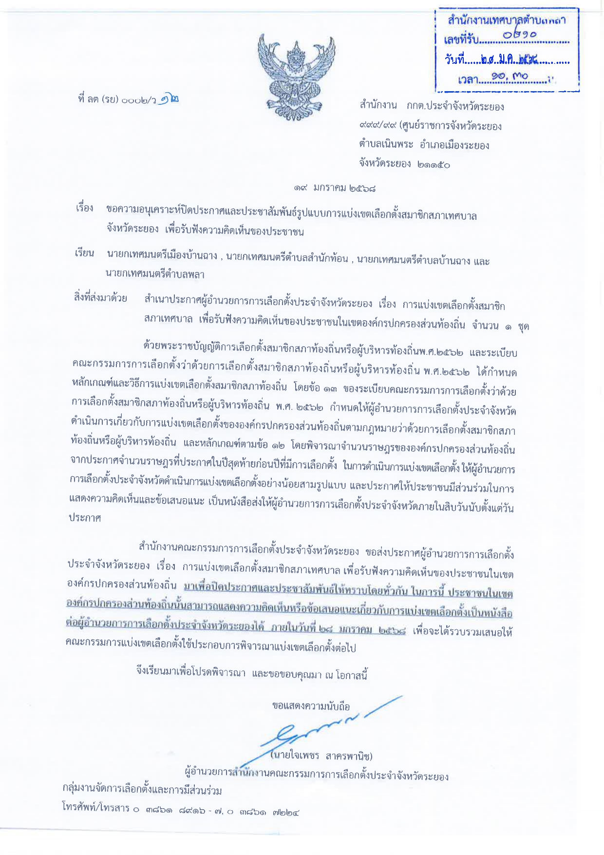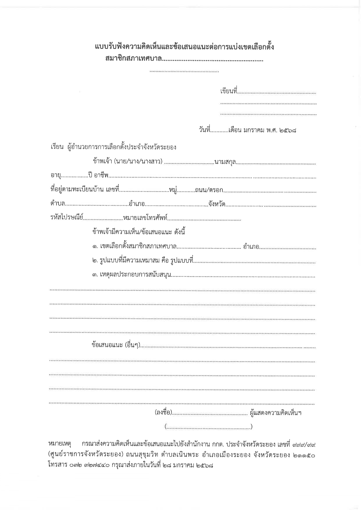 - โดยทำเป็นหนังสือส่งไปยังสำนักงานคณะกรรมการการเลือกตั้งประจำจังหวัดระยอง เลขที่ ๙๙๙/๙๙