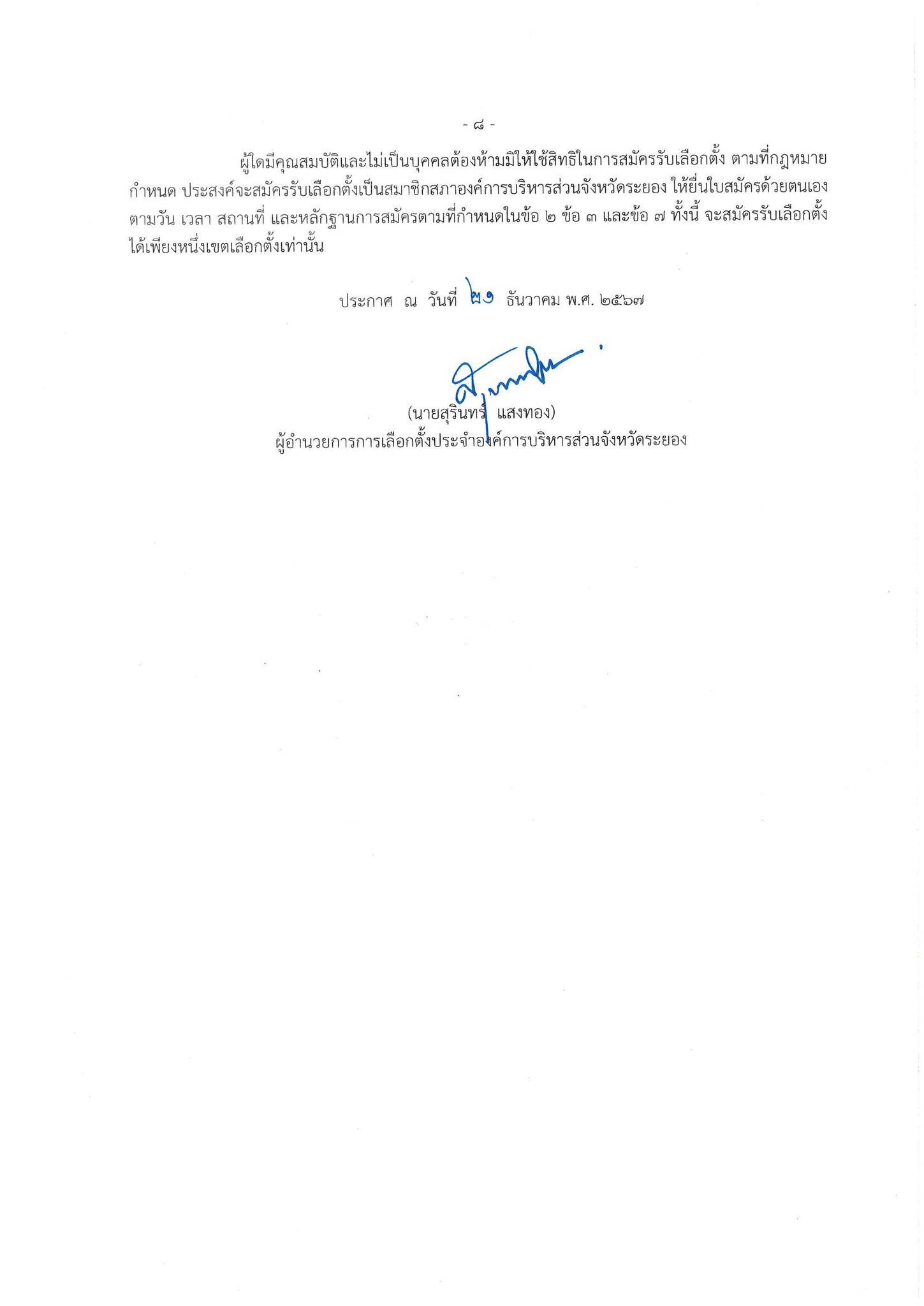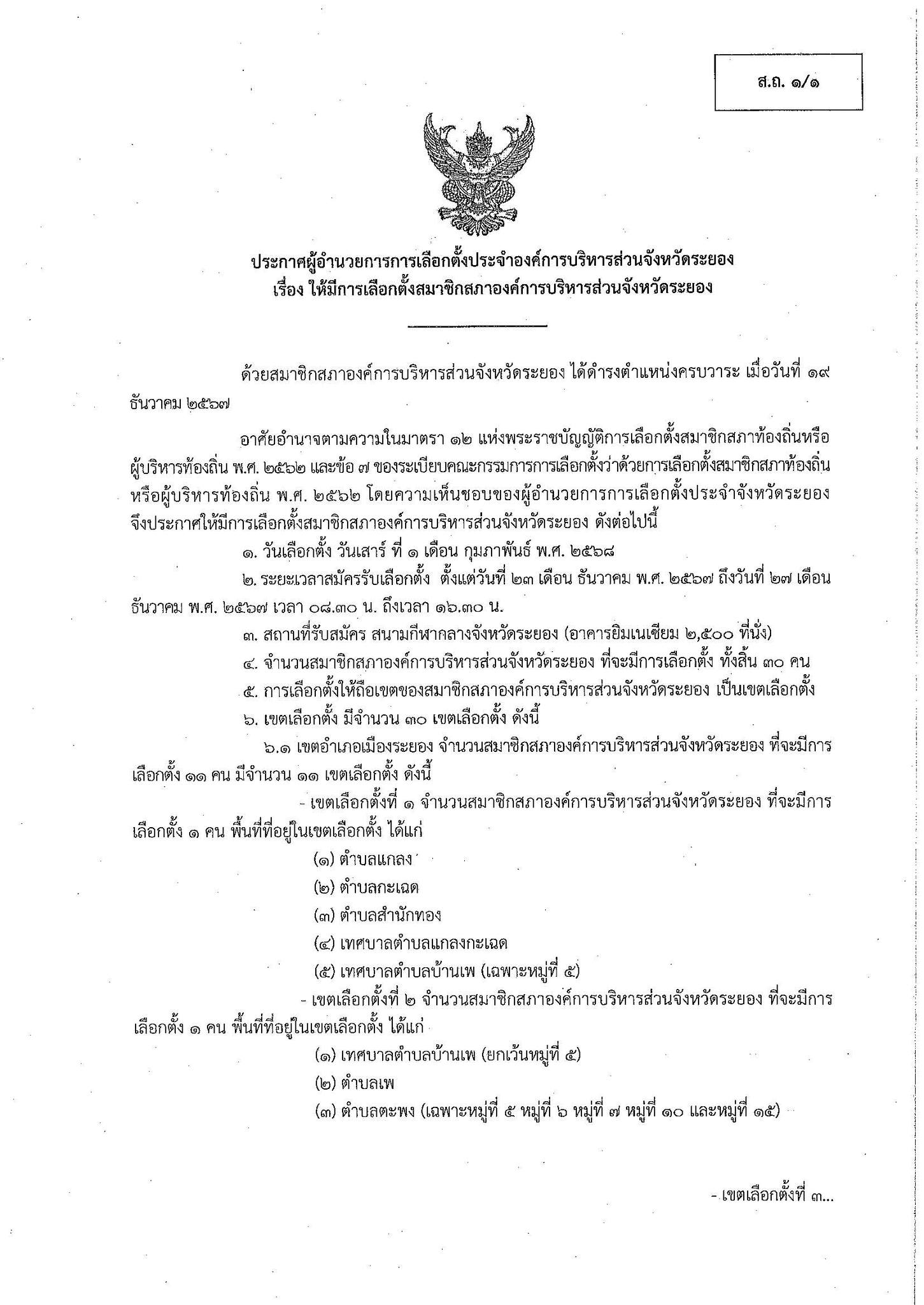 ประกาศให้มีการเลือกตั้งสมาชิกสภาองค์การบริหารส่วนจังหวัดระยอง