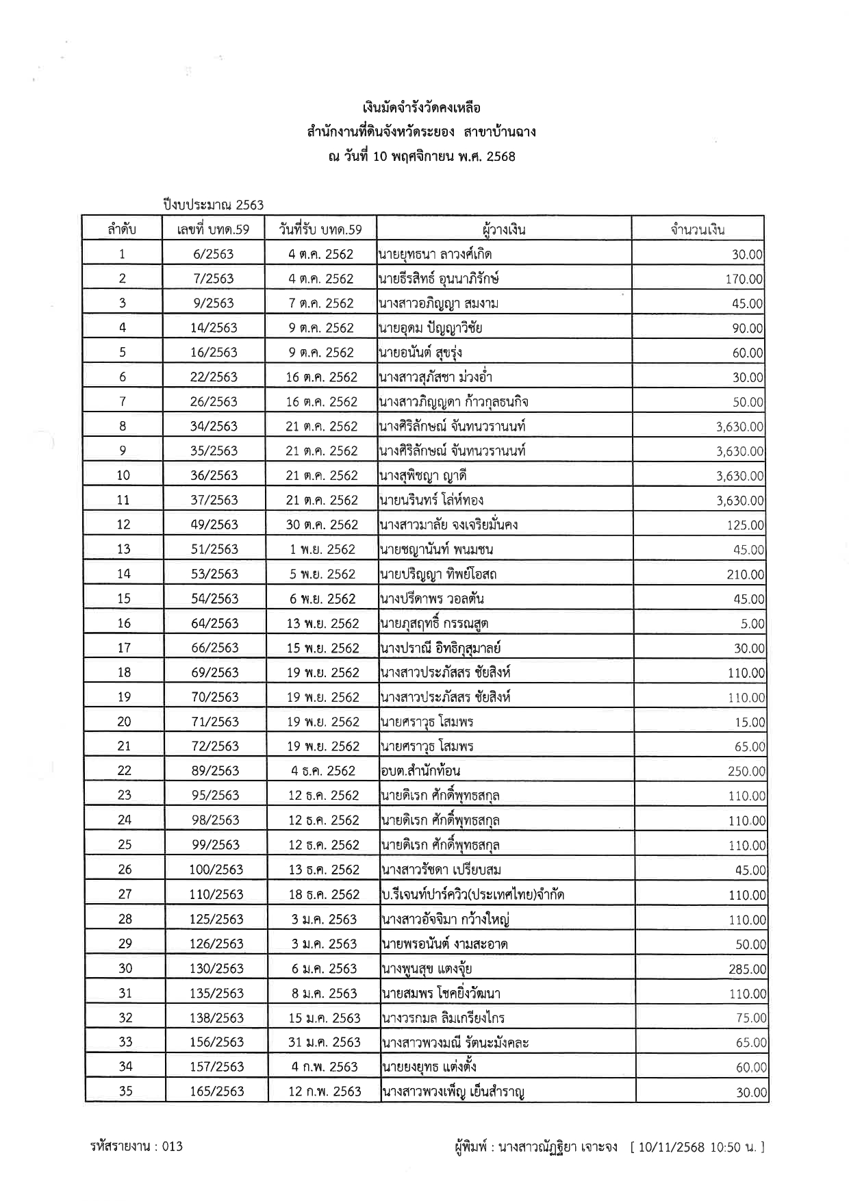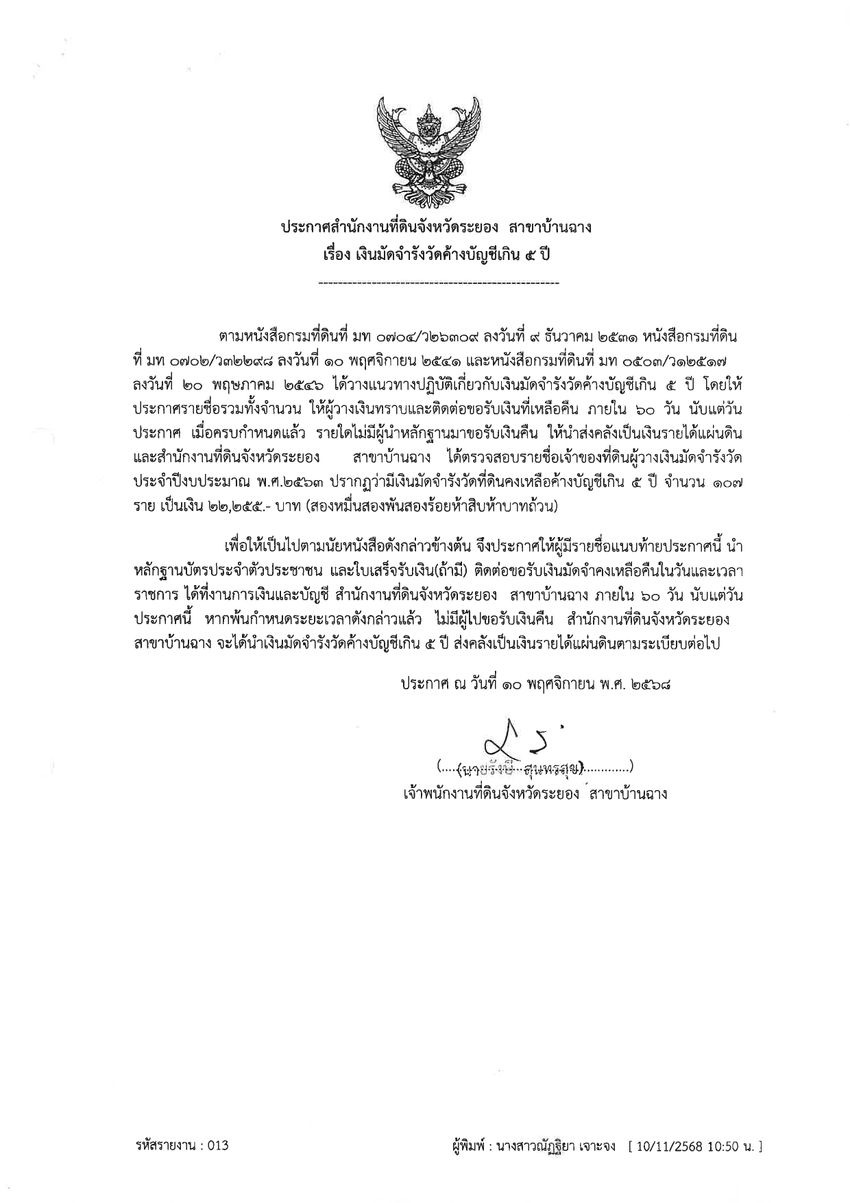 ประกาศสำนักงานที่ดินจังหวัดระยอง สาขาบ้านฉาง