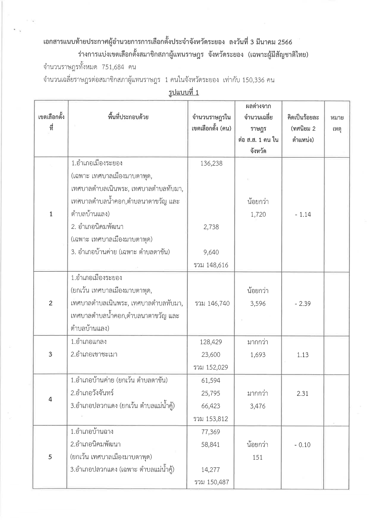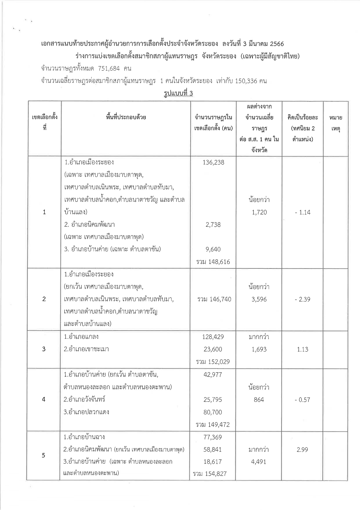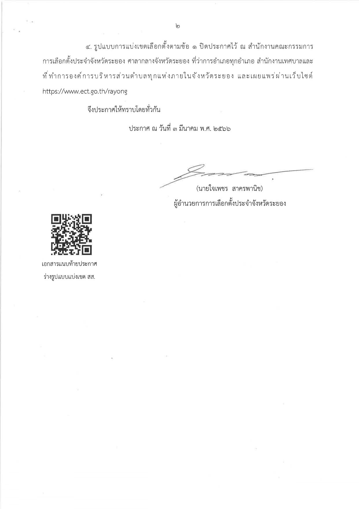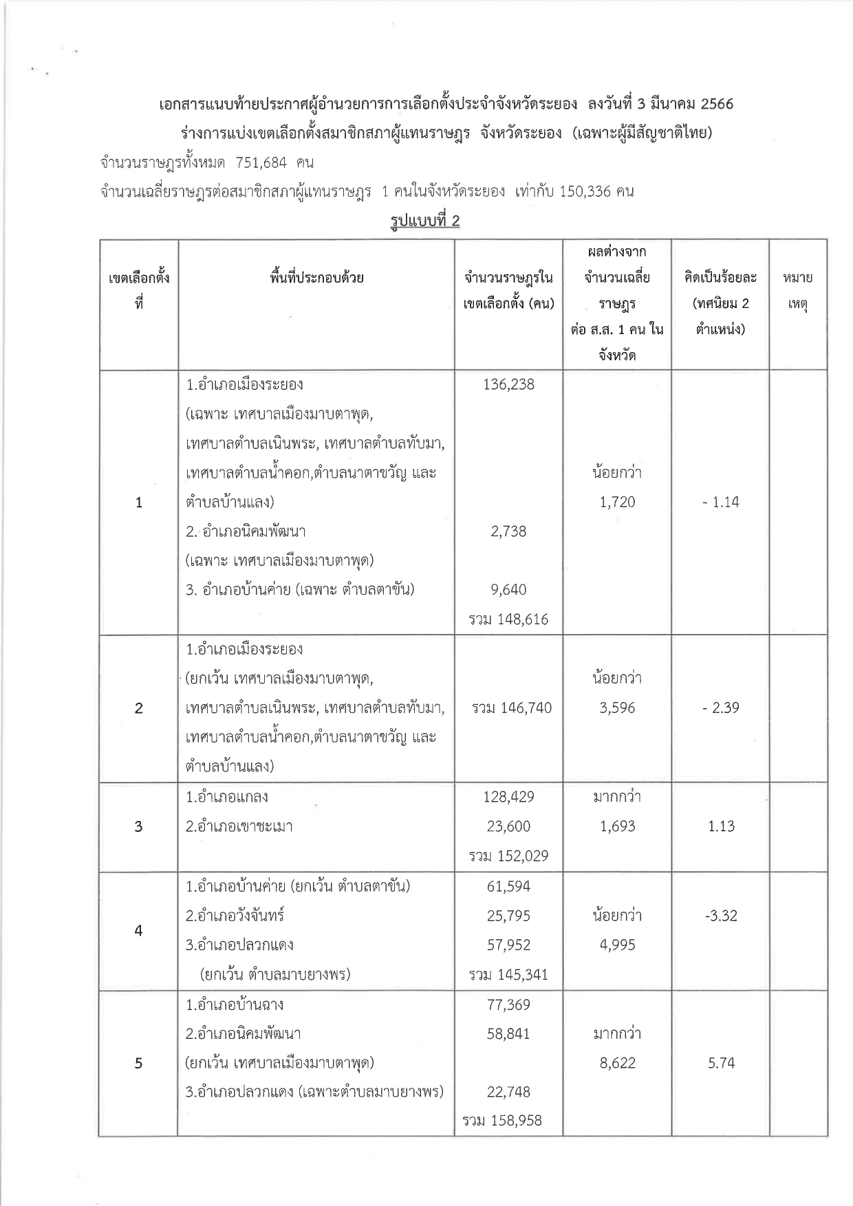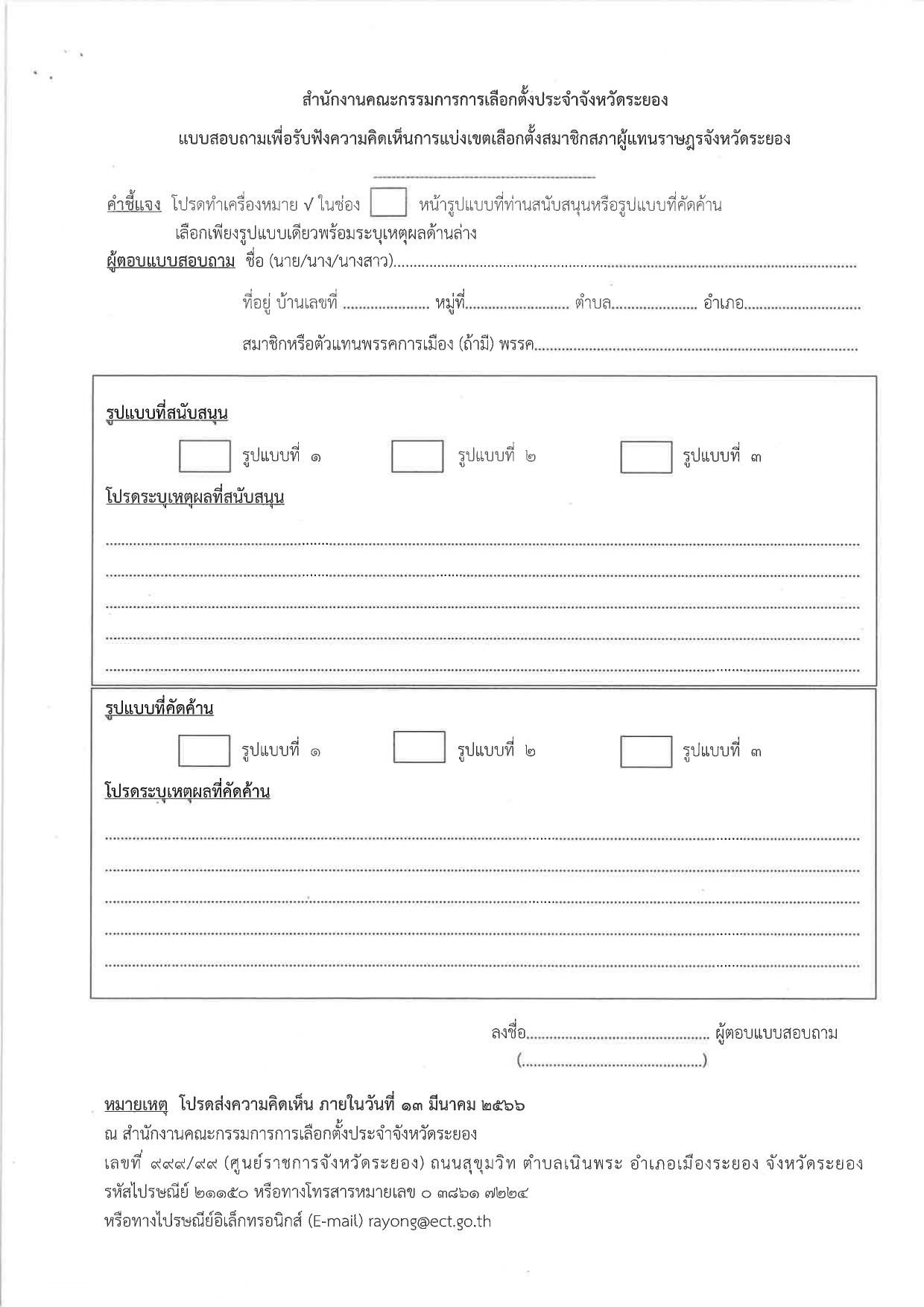 ต่อผู้อำนวยการการเลือกตั้งประจำจังหวัดระยองได้ ระหว่างวันที่ ๔ มีนาคม ๒๕๖๖ ถึงวันที่ ๑๓ มีนาคม ๒๕๖๖ เพื่อรวบรวมเสนอให้คณะกรรมการการเลือกตั้งใช้ประกอบการพิจารณาแบ่งเขตเลือกตั้งต่อไป สอบถามรายละเอียดเพิ่มเติมได้ที่ กลุ่มงานจัดการเลือกตั้งและการมีส่วนร่วม หมายเลขโทรศัพท์ ๐๓๘-๖๑๘๙๑๖-๗ โทรสาร ๐๓๘-๖๑๗๒๒๔