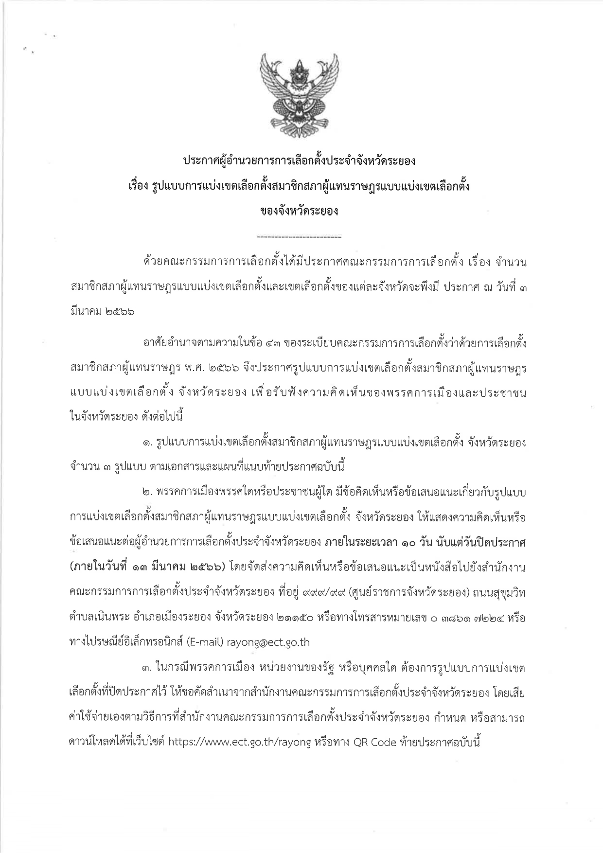 “ประกาศสำนักงานคณะกรรมการการเลือกตั้งประจำจังหวัดระยอง” เรื่อง รูปแบบการแบ่งเขตเลือกตั้งสมาชิกสภาผู้แทนราษฎรแบบแบ่งเขตเลือกตั้งของจังหวัดระยอง เพื่อรับฟังความคิดเห็นของพรรคการเมืองและประชาชนในจังหวัดระยอง ในการนี้ พรรคการเมืองและประชาชนในจังหวัดระยอง สามารถแสดงความคิดเห็นหรือข้อเสนอแนะเกี่ยวกับการแบ่งเขตเลือกตั้งดังกล่าว