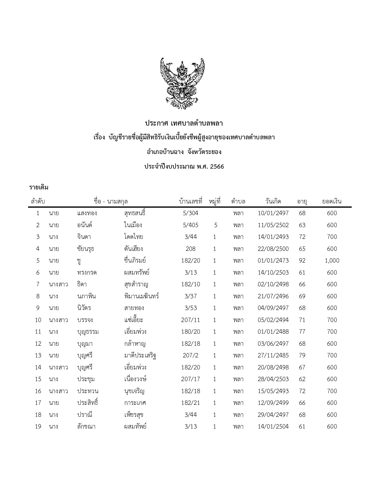 ประกาศ เทศบาลตำบลพลา เรื่อง บัญชีรายชื่อผู้มีสิทธิรับเงินเบี้ยยังชีพผู้สูงอายุของเทศบาลตำบลพลา ประจำปีงบประมาณ พ.ศ.๒๕๖๖
