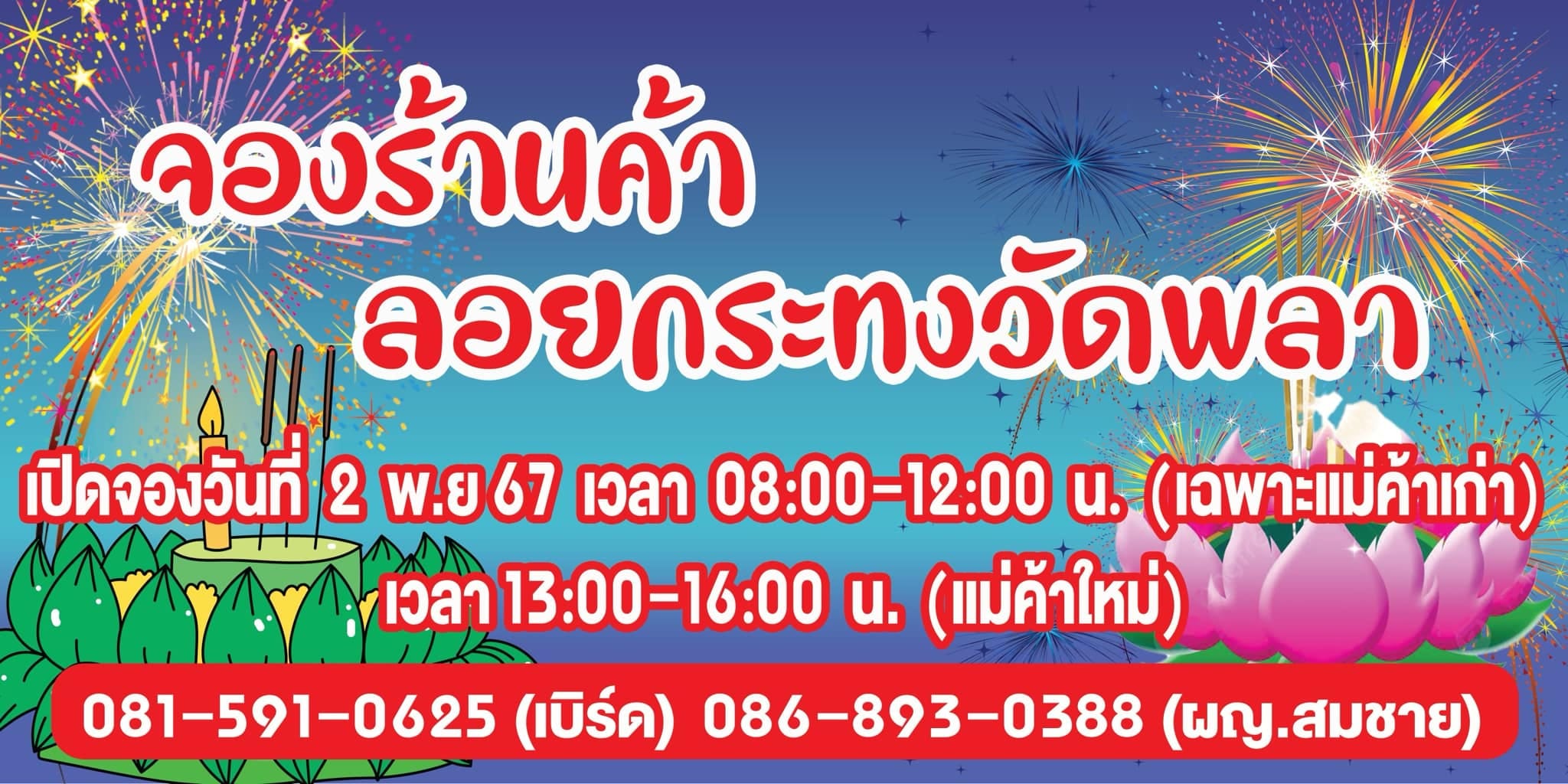 กำหนดการจองล็อคร้านค้าภายในงานลอยกระทงลงทะเลวัดพลา ประจำปี ๒๕๖๗