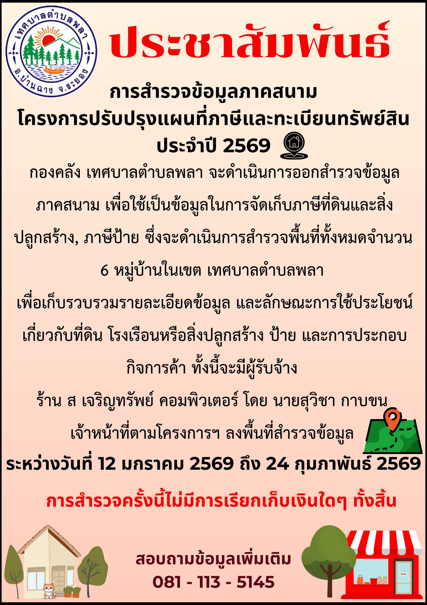 🏣กองคลัง เทศบาลตำบลพลา ได้ดำเนินการจัดทำ"โครงการปรับปรุงแผนที่ภาษีและทะเบียนทรัพย์สิน"