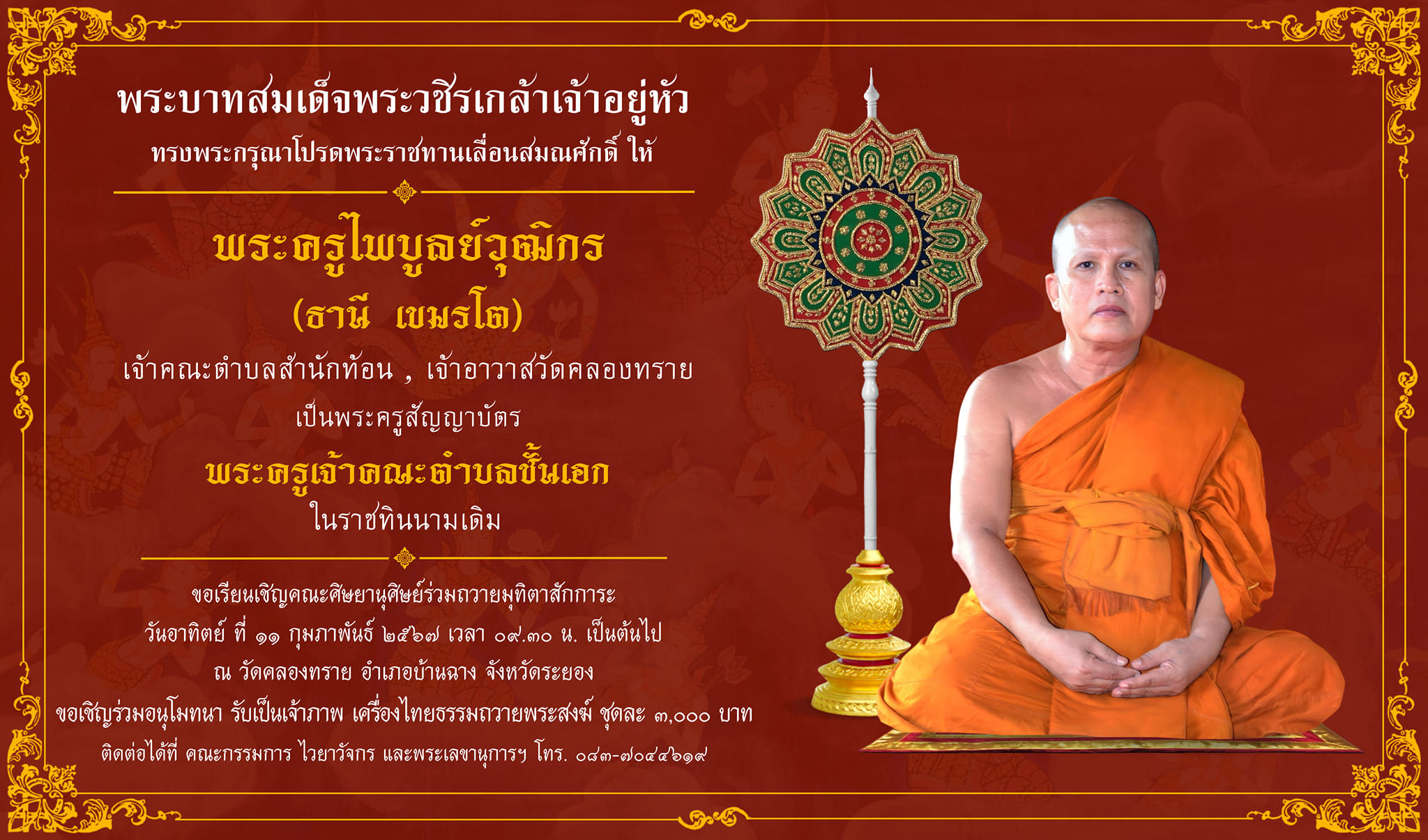 -วัดคลองทราย ตำบลพลา อำเภอบ้านฉาง จังหวัดระยอง ขอเรียนเชิญคณะศิษยานุศิษย์ร่วมถวายมุทิตาสักการะ"พระครูไพบูลย์วุฒิกร (ธานี เขมรโต)