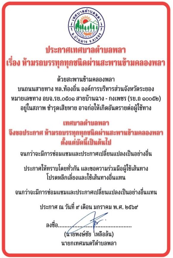 ประกาศห้ามรถบรรทุกทุกชนิด วิ่งผ่านสะพานข้ามคลองพลา
