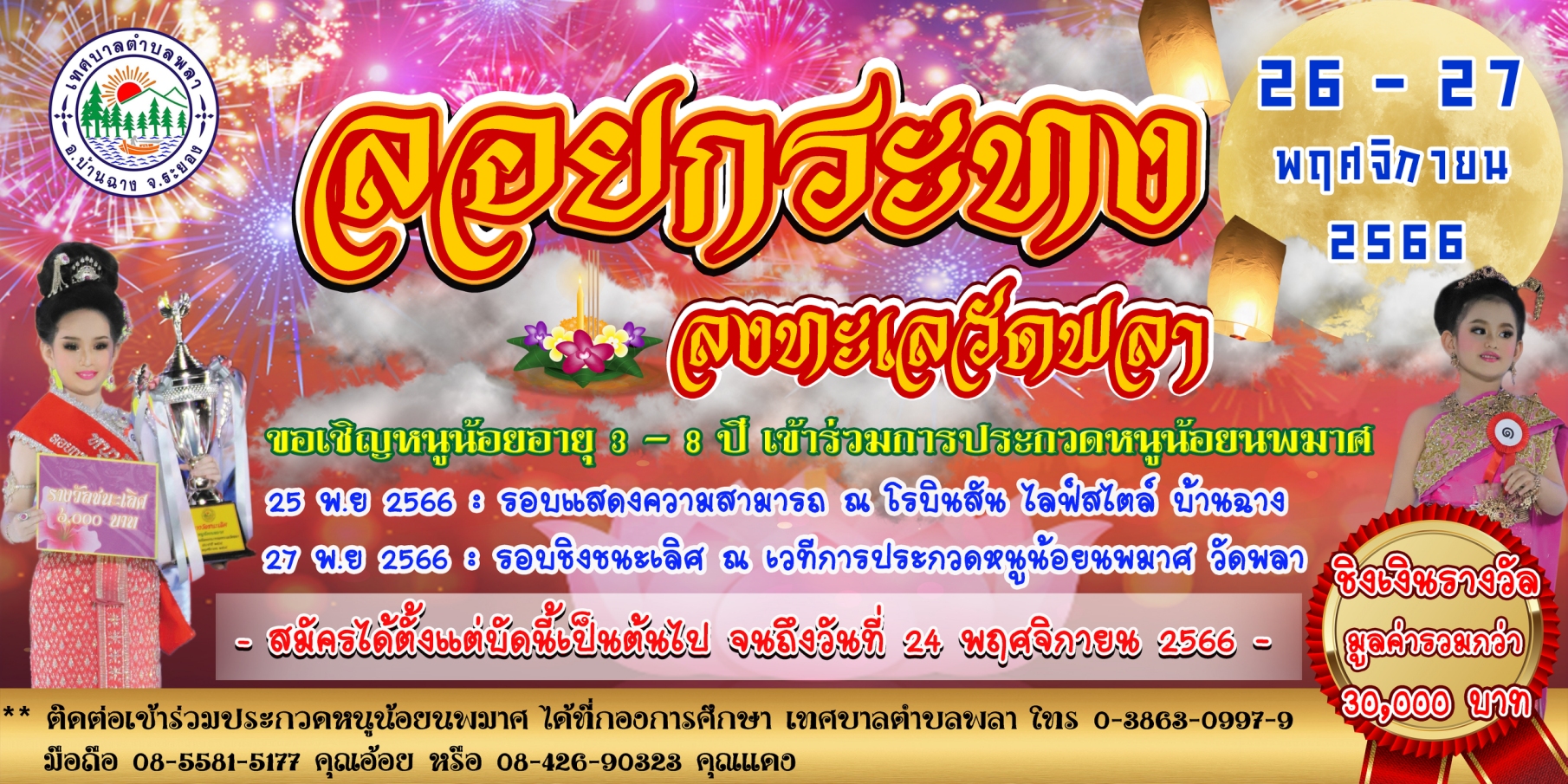 📢เทศบาลตำบลพลา ขอเชิญชวนผู้ที่สนใจส่งน้องๆหนูๆเข้าร่วม"การประกวดหนูน้อยนพมาศ"ในงานประเพณีลอยกระทง ลงทะเลวัดพลา ประจำปี ๒๕๖๖