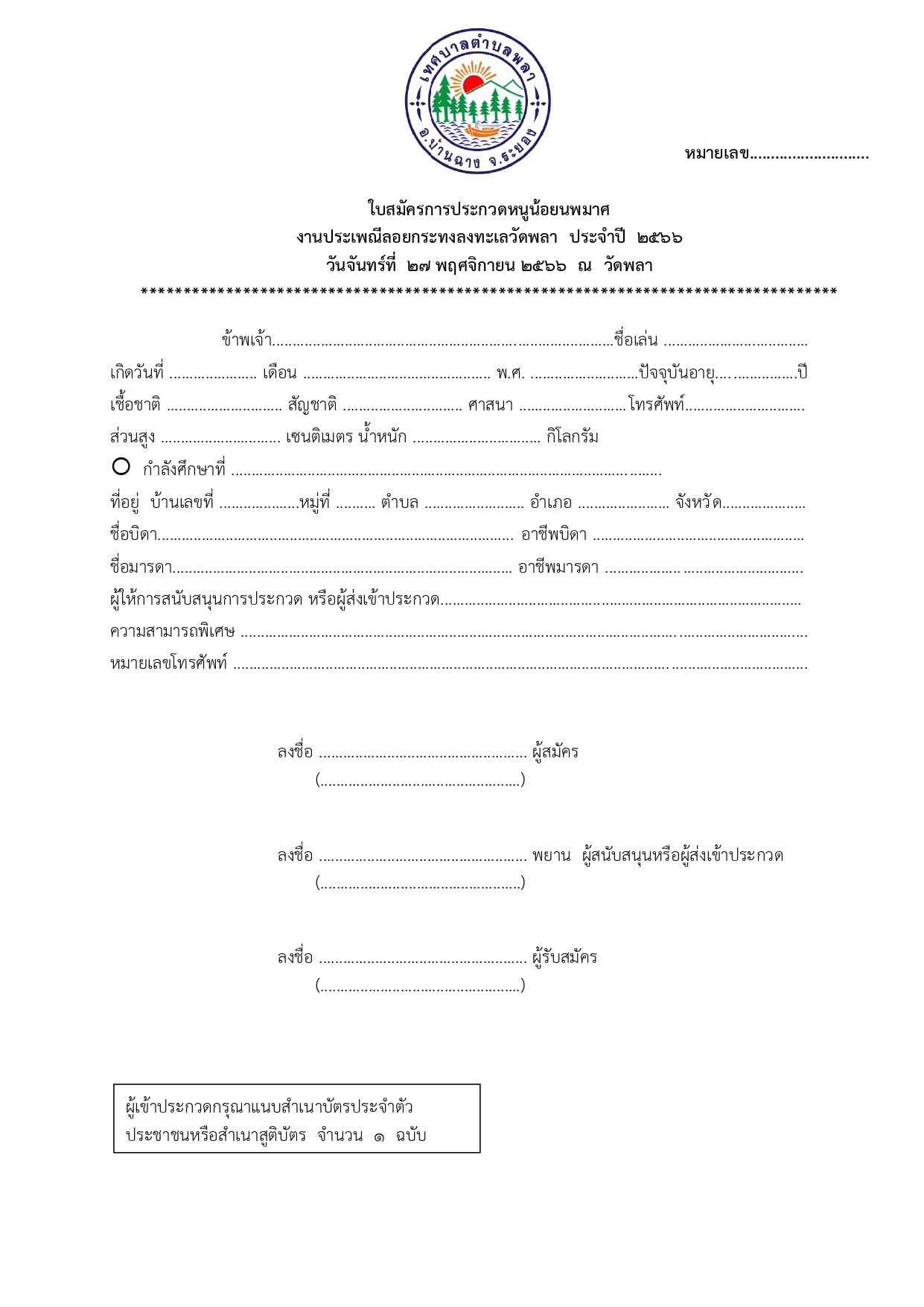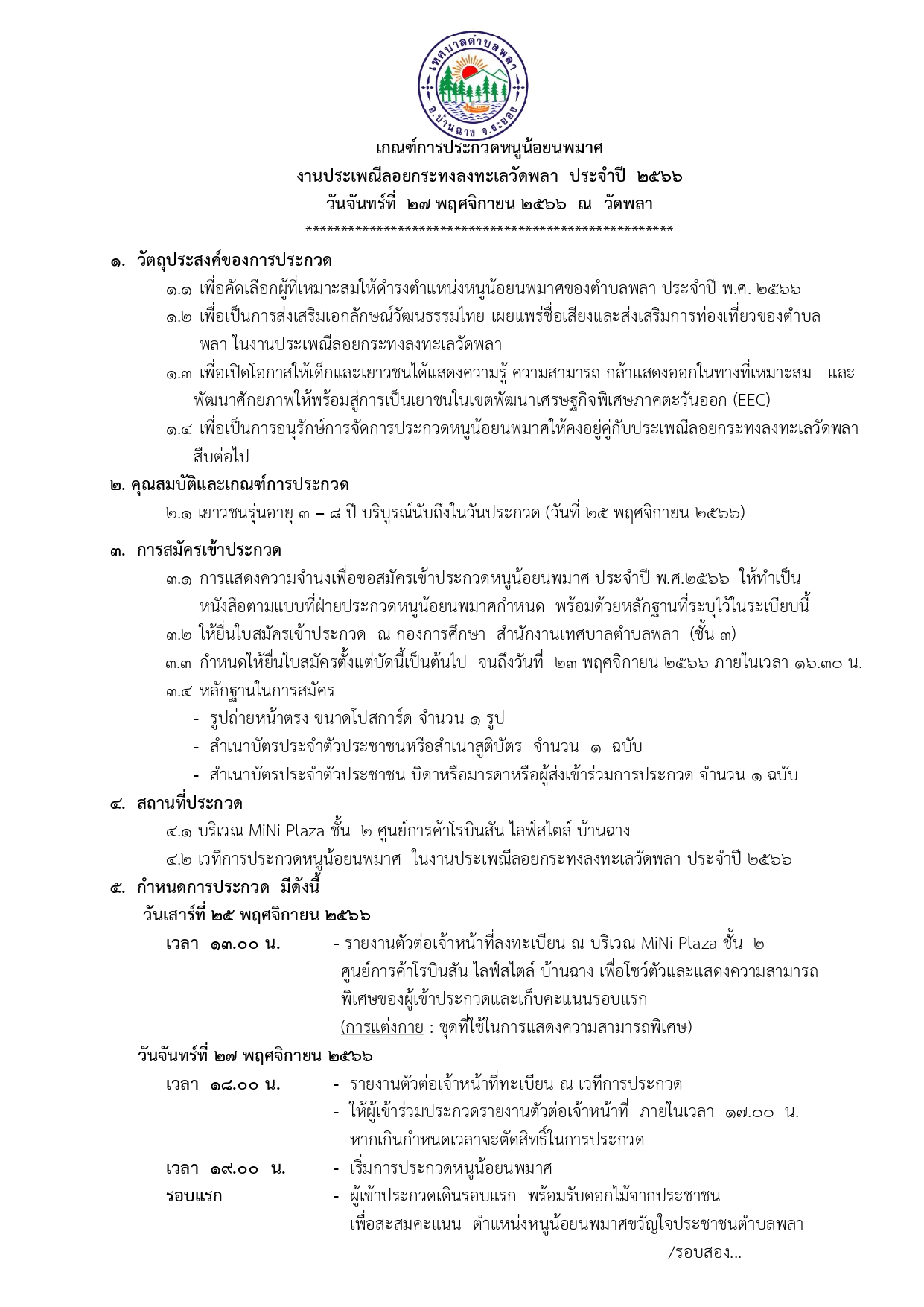 "ขอเชิญสมัครเข้าร่วมการประกวดหนูน้อยนพมาศ ในงานประเพณีลอยกระทง ลงทะเลวัดพลา"