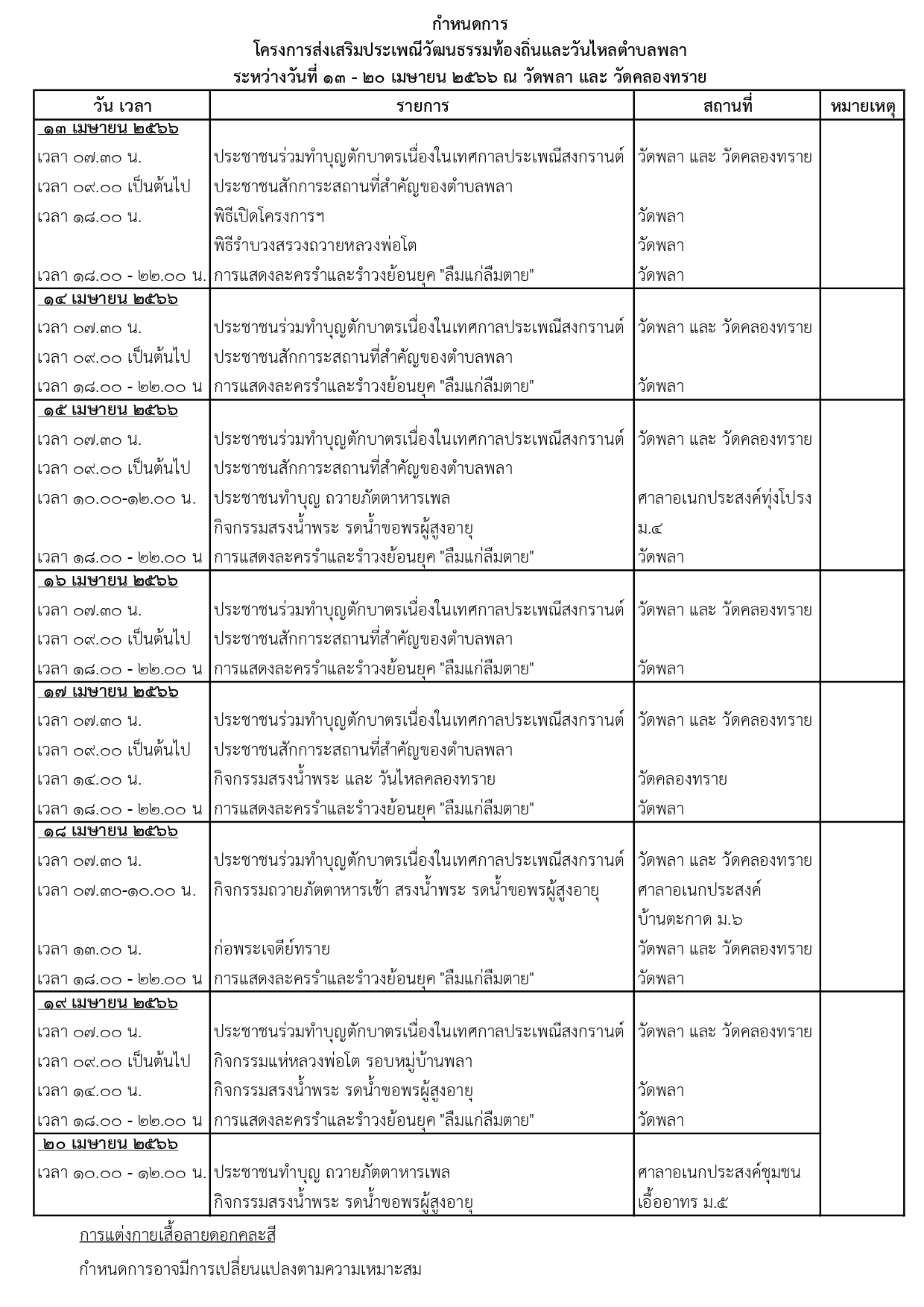 ระหว่างวันที่ ๑๓-๒๐ เมษายน ๒๕๖๖ ณ วัดพลา,วัดคลองทราย และสถานที่ตามที่ระบุไว้ในกำหนดการ