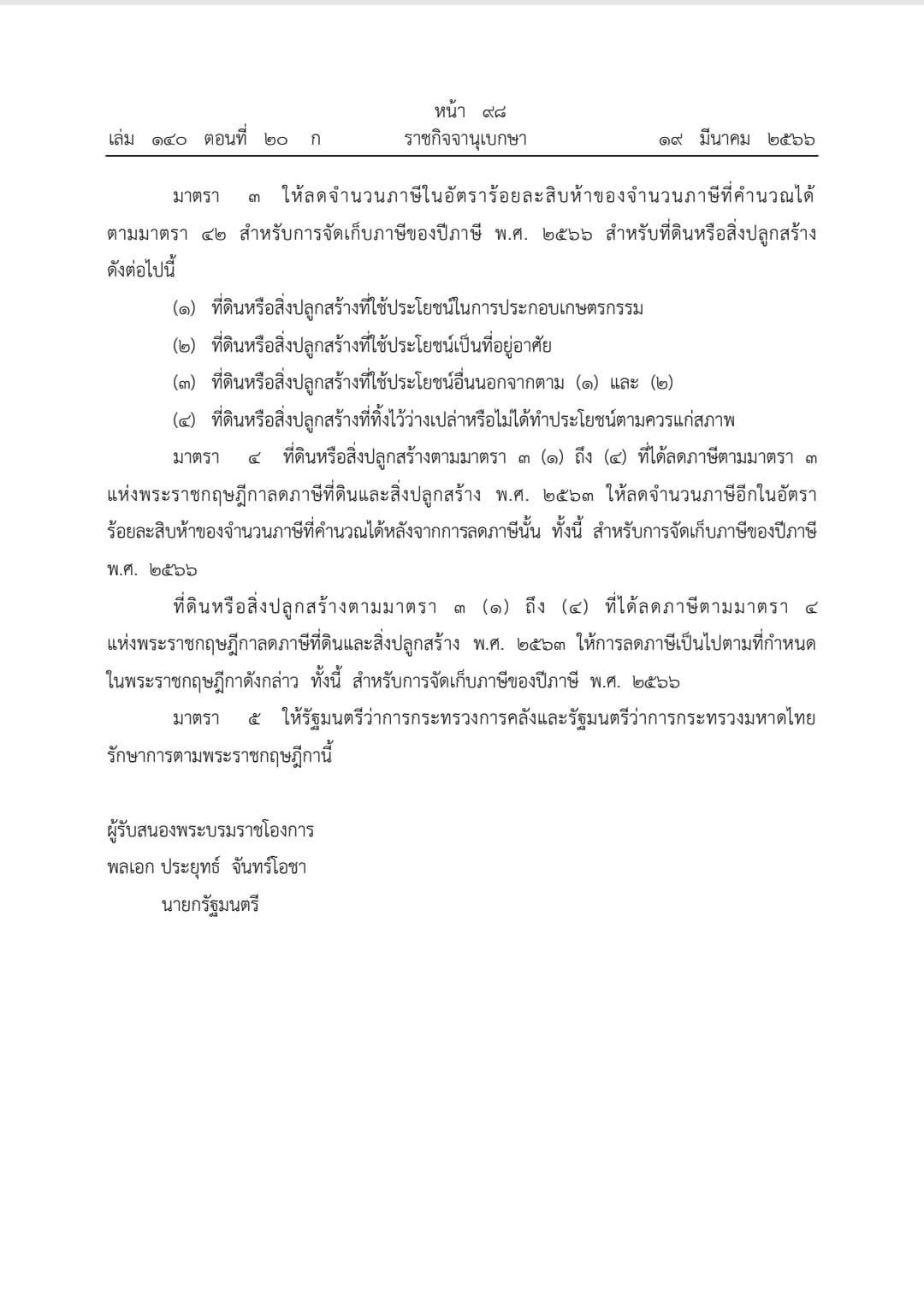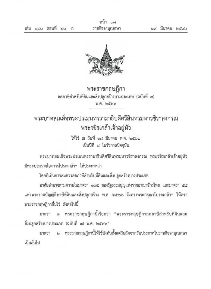 พระราชกฤษฎีกา ลดภาษีสำหรับที่ดินและสิ่งปลูกสร้างบางประเภท(ฉบับที่ ๓) พ.ศ.๒๕๖๖
