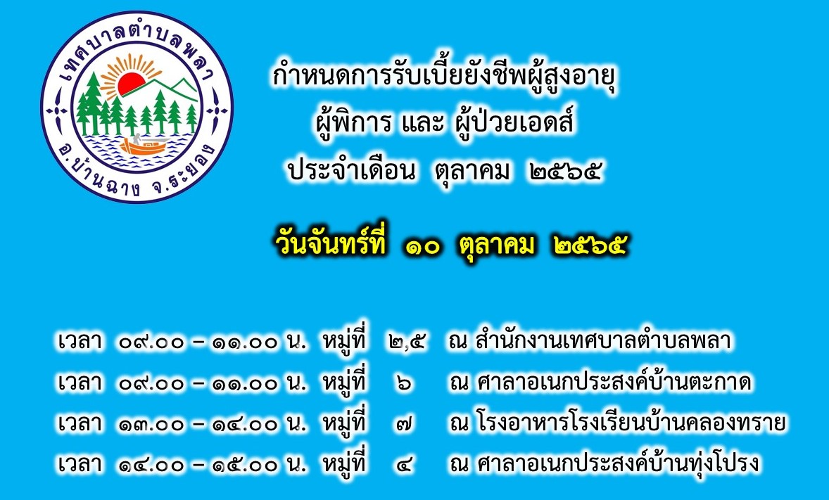 "กำหนดการรับเบี้ยยังชีพผู้สูงอายุ ผู้พิการ และผู้ป่วยเอดส์ ประจำเดือนตุลาคม ๒๕๖๕"