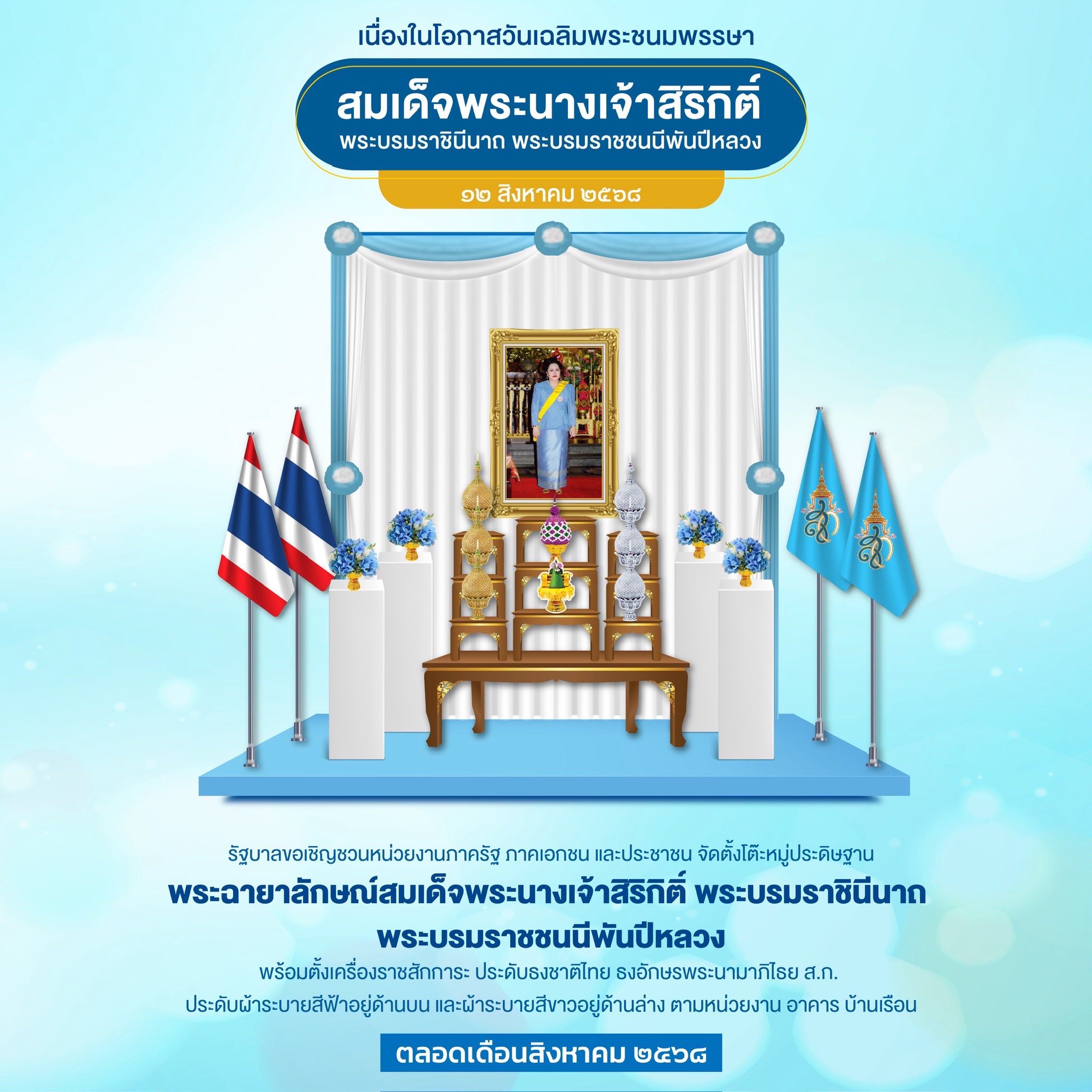 เชิญชวนหน่วยงานภาครัฐ ภาคเอกชน และประชาชน จัดตั้งโต๊ะหมู่ประดิษฐานพระฉายาลักษณ์สมเด็จพระนางเจ้าสิริกิติ์ พระบรมราชินีนาถ พระบรมราชชนนีพันปีหลวง พร้อมเครื่องราชสักการะ จัดตกแต่งสถานที่ โดยประดับพระฉายาลักษณ์สมเด็จพระนางเจ้าสิริกิติ์ พระบรมราชินีนาถ พระบรมราชชนนีพันปีหลวง ประดับธงชาติไทย และธงอักษรพระนามาภิไธย ส.ก. และประดับผ้าระบายสีฟ้าร่วมกับผ้าระบายสีขาว ตามอาคารสถานที่ของหน่วยงานและบ้านเรือน ระหว่างวันที่ ๑ - ๓๑ สิงหาคม ๒๕๖๘