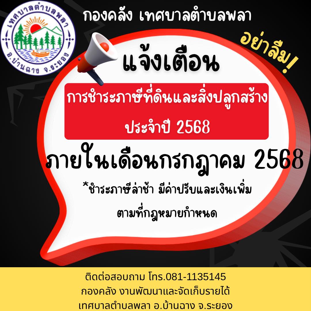 แจ้งเตือน การชำระภาษีที่ดินและสิ่งปลูกสร้าง ประจำปี ๒๕๖๘