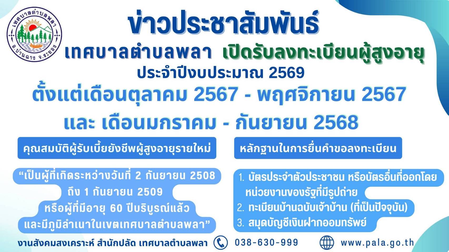 - เทศบาลตำบลพลา แจ้งประชาสัมพันธ์การเปิดรับลงทะเบียนผู้สูงอายุ ประจำปีงบประมาณ พ.ศ. ๒๕๖๙